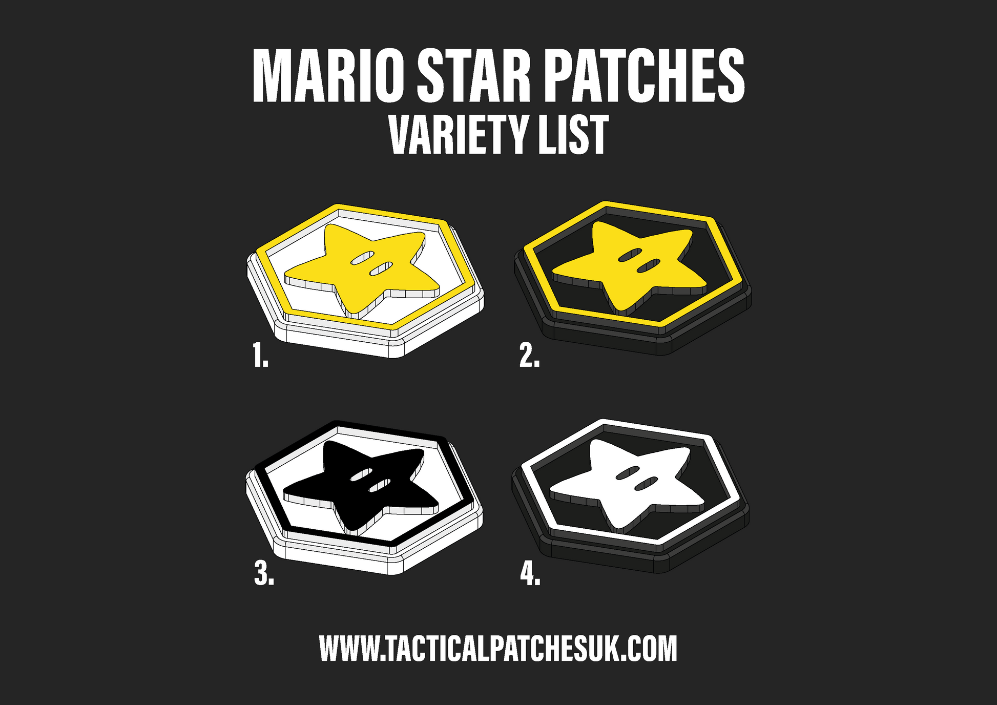 These Mario Star Velcro patches are a perfect addition to your tactical kit! Sized at 3.2cm high they are the perfect size for adding some style to your gear! Made from PLA 3D Printed Plastic, the patches are strong, waterproof and easy to clean. Available in multiple colour options you get to choose your style.